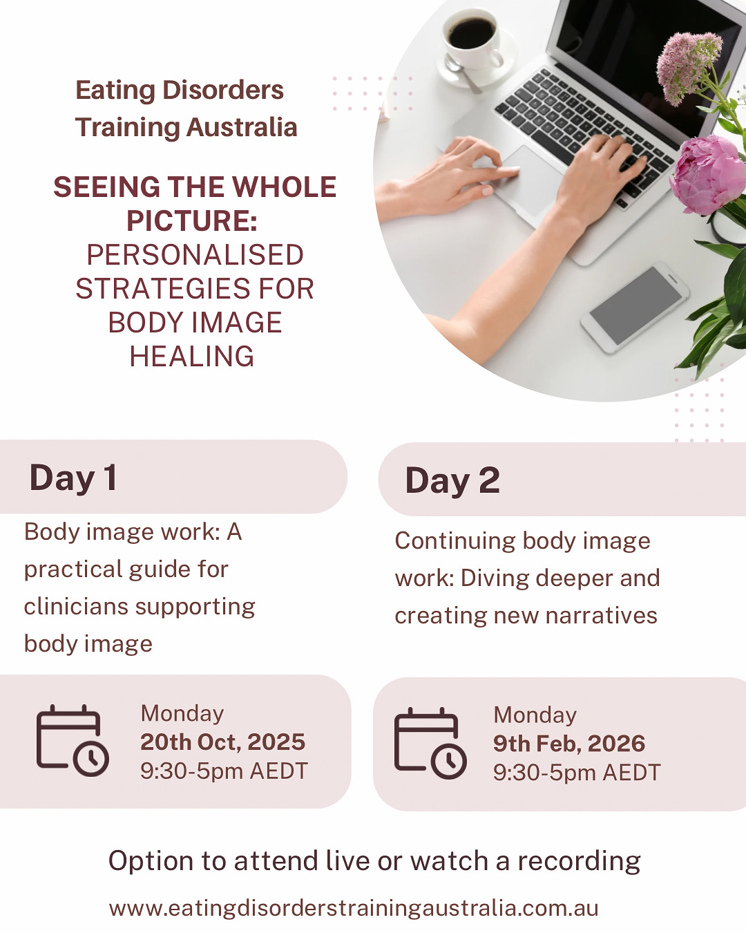 Price both Days COMBINED Day 1 and Day 2 body image training Seeing the whole picture: Personalised strategies for body image healing (live or recorded) - $795 including GST