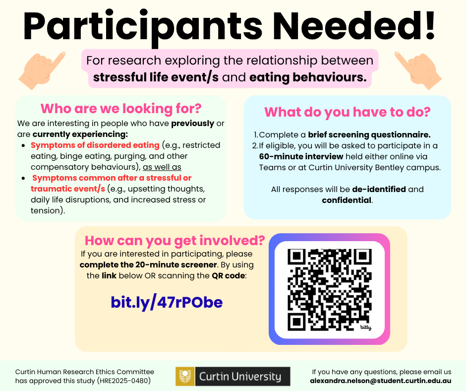 Disordered eating behaviour and trauma-related symptoms can have a significant impact on a person’s well-being, especially when they occur together. This project aims to interview individuals who have previously experienced or are currently experiencing symptoms of disordered eating and trauma-related symptoms, to gain a deeper understanding of how these experiences may interact.This project has two phases: